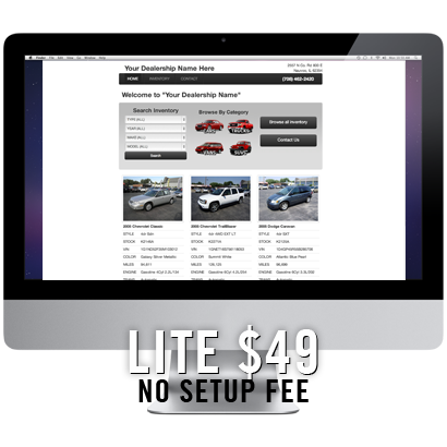 Clean, Simple, Inexpensive. Perfect for the car dealership that needs a quick and easy, low cost website solution. Includes access to our inventory management platform with VIN decoding and stock images. The Lite Template package will allow you to get your car dealership website live in as little as 24 hours. Website includes dealership logo integration and built in search engine optimization. Sign up today for your 30 day free trial with a 90 day money back guarantee! Click here to take a look at our Lite Car Dealer website demo.